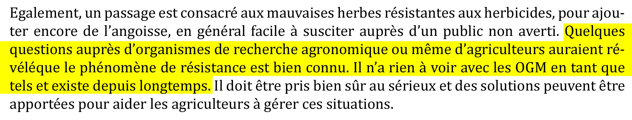 Je réalise pour la chaine canal plus un documentaire qui tente d’établir un premier bilan après 15 ans d’ogm. Nous sommes allés en Amérique Latine, où une majorité des cultures est ogm, soja notamment. Vos produits y sont très largement utilisés. Nous avons constaté un problème de plantes résistantes. Après quelques années de grande efficacité de vos herbicides couplés avec vos graines ogm, la nature a muté et les agriculteurs doivent trouver d’autres solutions.